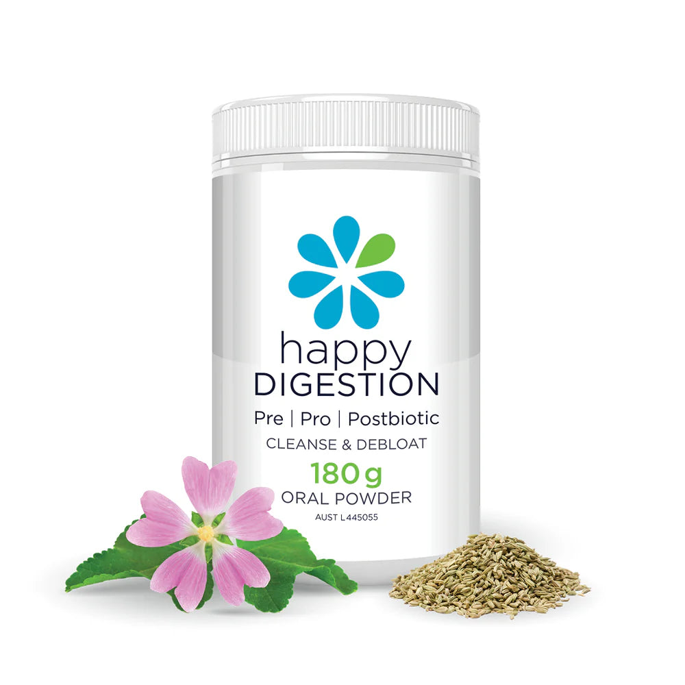 Happy Digestion contains a blend of prebiotics, probiotics, and postbiotics to soothe, regulate and improve gastrointestinal function. Stress, poor diet and the environment we live in, all impact the integrity and strength of our gut.
